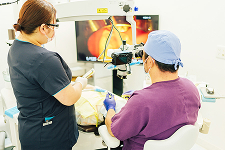 しかし、この「歯の根の治療」を肉眼で行うということは、真っ暗な部屋のホコリを掃除するようなものです。残さずにすっかり拭い取れるでしょうか? 従来型の肉眼による治療は、勘と経験が頼りです。培ってきた経験は確かな力になりますが、治療部位を把握できれば、さらに治療精度を高められます。そのため当院では、歯科顕微鏡や拡大鏡、そしてLEDライトを活用して、患部を明るく照らしながら拡大して”見て”、治療します。